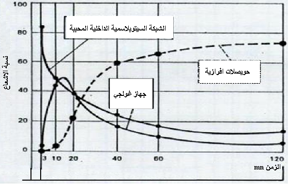 http://s.martinez.free.fr/V2/biologie/notions/1020-cellule-foie-pancreas.html من خلال الوثيقة يتبين أن الإشعاع يظهر أولا على مستوى الشبكة السيتوبلاسمية الداخلية المحببة، يتناقص بعد ذلك وبالمقابل يرتفع على مستوى جهاز غولجي ويتراجع بدوره ليتبعه ظهور على مستوى الحويصلات الإفرازية. يتبين إذن أن دخول الأحماض الأمينية إلى الخلية يصاحبه تركيب للبروتينات على مستوى الشبكة السيتوبلاسمية الداخلية المحببة (ذلك باستعمال الطاقة ATP الناتجة عن تفكيك المادة العضوية ) ثم تنتقل هذه البروتينات إلى جهاز غولجي، بعده إلى الحويصلات الإفرازية ومن تم إلى خارج الخلية الإفرازية عن طريق ظاهرة الإخراج.انظر الوثيقة