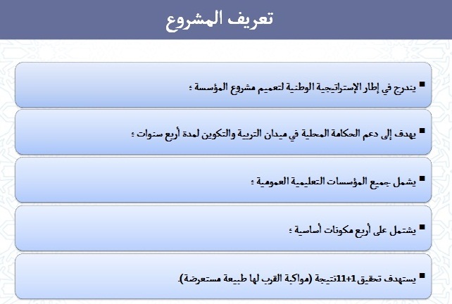 إننا لم ننطلق من الصفر لإنجاز عملياتنا التربوية، وكما تعلمون يتحدث القاموس التربوي للوزارة منذ منتصف التسعينات عن مشروع المؤسسة الذي يعتبر خارطة طريق لأجرأة كل الاقتراحات والتصورات، واستثمارا لكل التراكمات السابقة، وفي إطار التعاون مع الحكومة الكندية وضعت الوزارة الأسس الضرورية لجعل كل مؤسسة تعليمية تضع مشروعها باستحضار خصوصياتها التربوية في أفق أجرأتها .