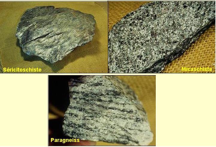 نلاحظ انه كلما اتجهنا من الشيست إلى الغنايس ازداد قد البلورات مع اختلاف في بنية الصخور. الشيست: ذات بنية شبستية تأخذ خلالها المعادن اتجاها دالا على اتجاه القوى التي تعرضت إليها الصخرة. الميكاشيست: ذات بنية شيستية إلى توريقية، تتجمع خلالها المعادن على شكل أسرة دقيقة مما يجعل الصخرة سهلة الانفصام. الغنايس: ذات بنية توريقية، تتعاقب بها المعادن على شكل أسرة فاتحة وأخرى داكنة يجعل الصخرة غير قابلة للانفصام.