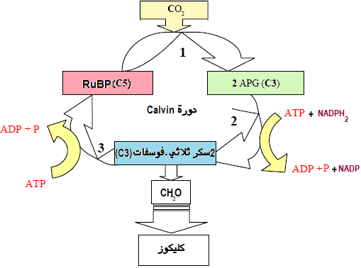 يمكن إذا تمثيل هذه التفاعلات على شكل دورة(حلقة calvin) حيث تنقسم إلى ثلاث مراحل:
