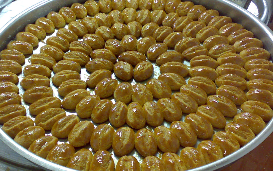 تخلط جميع المقادير مع بعضها وتخلط جيدا وحتى تصبح العجين يابسا لايلذق فى اليد تدهن القوالب بالسمن خفيف حتى لاتلصق تاخد قعط صغيرة من العجينةتلف بين راحة اليدين لتكون مثل العين اى الشكل البيضاوى المدبب وتوضع فى القوالب وتترك مسافة بين كل واحده والاخرى لانها سوف تكبر وتزيد فى الحجم بعد الطهى وبعد الانتهاء من العجين كله تتدهن بصفار البيض وتوضع فى الفرن