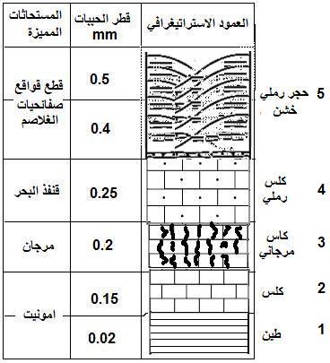 2 ـ صنف كل من الحبات الملاحظة؟ 3ـ ماذا تستنتج اذا كان اغلب الحبات من الصنف c التمرين 5 : يعطي الجدول التالي بعض المعلومات حول الترسب البحري