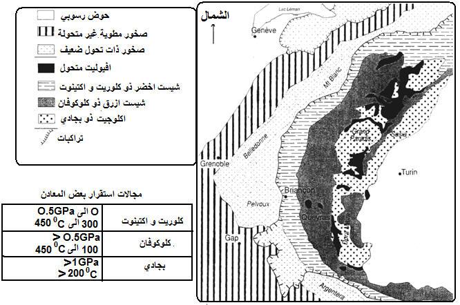 التمرين 9: تمثل الوثيقة جانبه جزء من الخريطة الجيولوجية للالب الايطالية الفرنسية و مجالات استقرار بعض المعادن. 1 ـ استخرج من هذه المعطيات المؤشرات التي تدل على طمر قديم. 2 ـ حدد على الخريطة منحى الطمر، علل جوابك.