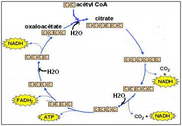 يدخل أستيل كوأنزيم A في حلقة من التفاعلات يتم خلالها انتزاع الكربون على شكل CO2، واختزال جزيئات ناقلة NAD و FAD إلى NADH و FADH2 ، مع تكون طاقة ATP. مجموع هذه التفاعلات تسمى حلقة KREBS .