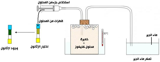 ـ التجربة2: تعكر ماء الجير دليل على طرح CO2 كما يظهر اختبار الاثانول أن الوسط غني بهذا الكجول.