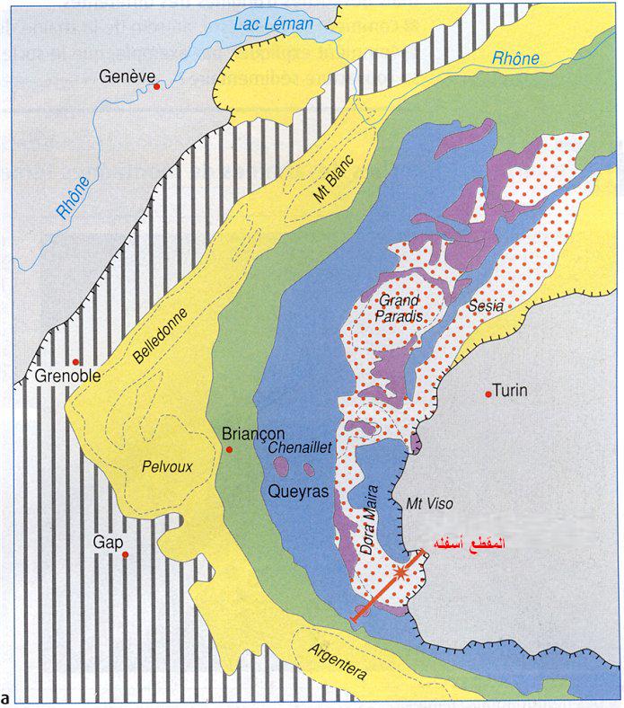 نلاحظ تداخل الصخور المتحولة مع الافيوليت كما أن هناك زيادة في شدة التحول من الشيست الأخضر إلى الشيست الأزرق ثم إلى الاكلوجيت.