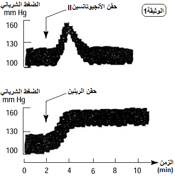 المعطى الثاني: يتم تبنيج كلاب سليمة ونقيس تغيرات الضغط الشرياني بـ (mmHg) بعد حقن الرينين والانجيوتانسين II، تمثل الوثيقة1 النتائج المحصل عليها.