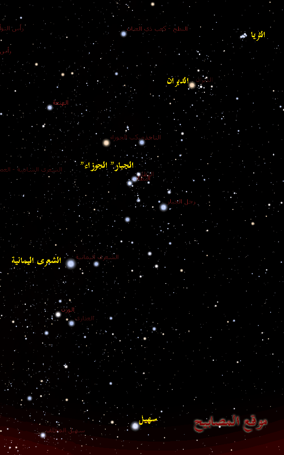 يقع نجم سهيل ملاصقا للأفق الجنوبي ، جنوب كوكبة "الكلب الكبير" . بين كوكبة