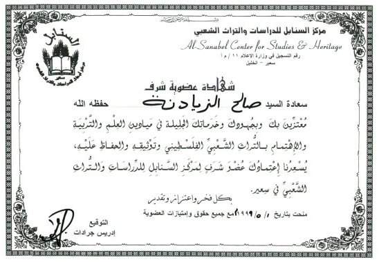 شهادة عضوية شرف من مركز السنابل للتراث الفلسطيني  ، أعطيت بتاريخ 1/5/1999م .