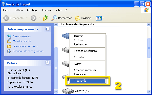 - Cliquez au moyen du bouton droit de la souris sur le lecteurque vous désirez défragmenter, et sélectionnez propriétés.