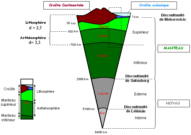 1 -La structure interne de la Terre est répartie en plusieurs enveloppes successives, dont les principales sont la croûte terrestre, le manteau et le noyau. - la croûte terrestre: c'est la partie superficielle et solide de la terre. On reconnaît deux types de croûte terrestre: - la croûte océanique: se situe sous les océans, avec une épaisseur moyenne de 7 km. Elle est formée de roches basaltiques de densité 3,2 - la croûte continentale: se situe au niveau des continents, elle est plus épaisse avec une épaisseur moyenne de 30 km. Elle est essentiellement de nature granitique et de densité 2,7 à 3. - Le manteau: C’est l’enveloppe la plus importante du globe terrestre, il est situé sous la croûte terrestre, à une profondeur comprise entre 10 et 2900 kilomètres environ. Il est séparé de la croûte par la discontinuité du Moho (Mohorovicic) et il est divisé en manteau supérieur et manteau inferieur. La partie supérieur du manteau supérieur est rigide et forme avec la croûte terrestre la lithosphère. Alors que la partie inferieur du manteau supérieur est plastique, appelée l'asthénosphère. - Le noyau: il est divise en: - Noyau externe liquide qui est séparé du manteau par la discontinuité de Gutenberg. - Noyau interne solide qui est séparé du noyau externe par la discontinuité de Lehmann. |